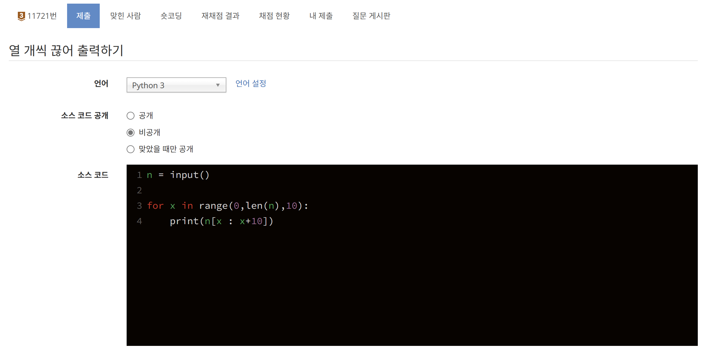 * 0부터 len(n)까지 for문 돌리면서 10개씩 출력하기